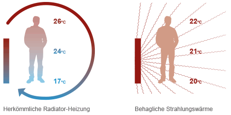 Strahlungswärme ist physiologisch günstig und angenehm. Sie bewirkt ein Temperaturempfinden, das über der tatsächlichen Lufttemperatur liegt.