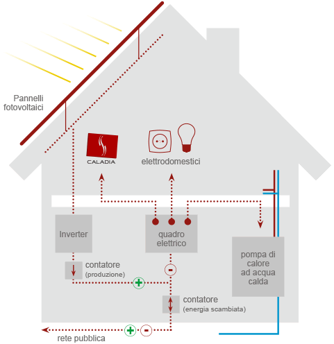 La combinazione tra riscaldamento elettrico e pannelli fotovoltaici sfrutta i vantaggi di entrambi i sistemi: l'incredibile efficienza energetica di CALADIA si coniuga con il risparmio e la sostenibilità ambientale assicurati dall'energia solare. Grazie alla possibilità di accumulare l'energia elettrica nella rete di distribuzione pubblica, l'energia prodotta in eccesso durante l'estate può essere utilizzata durante l'inverno per il riscaldamento.